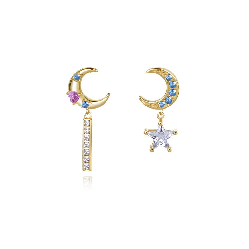 Orecchini pendenti asimmetrici con mezzaluna e stella in zirconia cubica