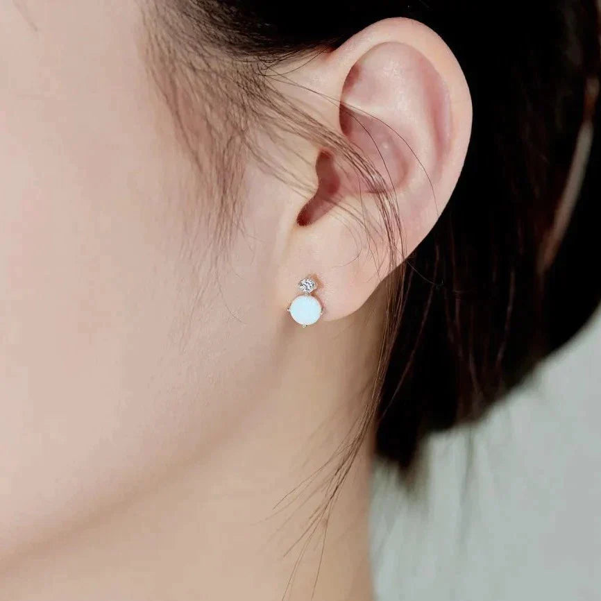 Un paio di semplici orecchini a bottone in opale rotondo, ornati con dettagli in zirconia cubica (CZ), offre un accessorio delicato ed elegante con un tocco di brillantezza. Gli orecchini presentano un design classico e senza tempo, con ogni bottone che mostra un opale perfettamente rotondo al centro. Il gioco di colori iridescenti degli opali aggiunge un fascino sottile ma accattivante agli orecchini, creando un effetto ipnotizzante ed etereo mentre la luce interagisce con le pietre.